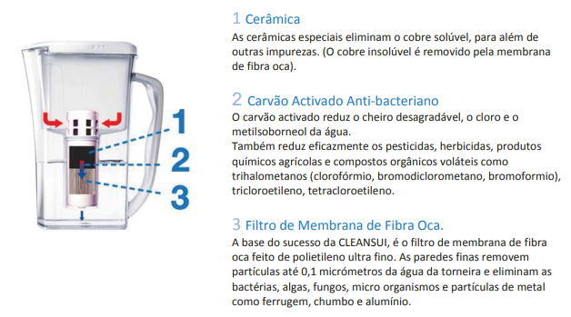 O sistema avançado de filtragem Cleansui, usa uma combinação de Cerâmica, Carvão Activado Anti-bacteriano e Membrana de Fibra Oca para remover TODAS as substâncias indesejadas da água de torneira, dando-lhe sempre água limpa e saborosa.